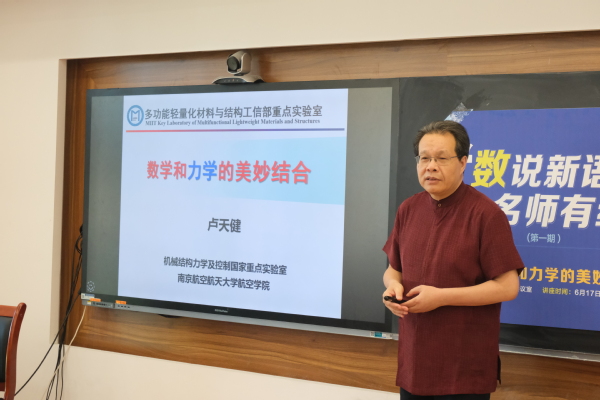 作为力学学科的顶尖学者,卢天健以“大道至简”描述自己对力学的认识,通过宇宙大爆炸的力学行为强调“力学,既是基础科学,也是工程科学,其概念是广泛而多样的。”同时,卢天健详细介绍了力学与生命体、脑力学、极端力学等力学与其他学科的交叉融合情况,指出“力学贯穿于大部分科研领域、贯穿于不同类型的理论研究,还连结众多学科。”最后,卢天健结合自己研究了20余年的超轻多孔材料和结构,从知识科普的角度与同学们探讨分析了其中的力学原理,并通过介绍团队承担的项目情况,指出降低结构重量是航空航天追求的永恒主题,而超轻多孔材料和结构也将是未来军舰、飞机、高铁、医学等领域的重点研究对象。