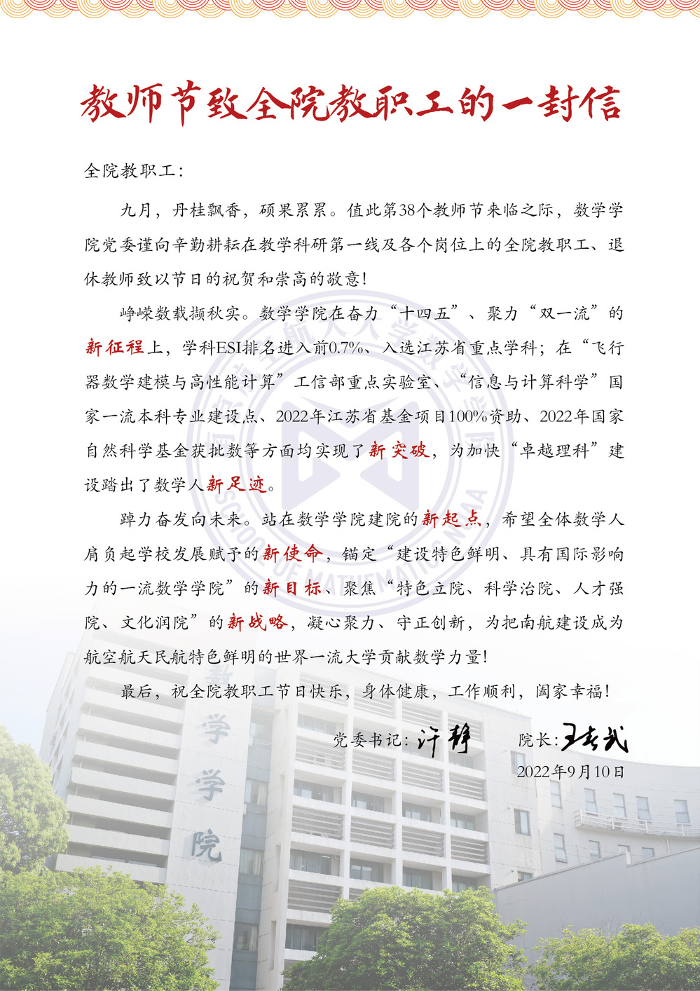 教师节致全院教职工的一封信