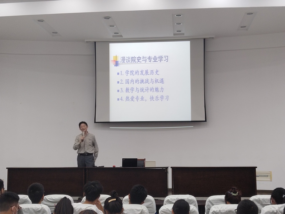 倪勤曾担任理学院院长,对学院、学科发展历程非常熟悉,对数学有着深刻理解。讲座中,他详细讲述了学院的发展历程,并结合今年全国招生信息情况和南航洪爷 办学特色,全面分析了学院学科发展面临的全新挑战,以及南航数学学子特有的发展机遇。 他详细介绍了信息与计算科学、应用统计学两个专业的创建和发展过程。他提到,人类进入人工智能与大数据时代,这个时代需要大量的数学与统计类人才。我们两个专业正是为这个时代培养所急需的人才,所以同学们一定要坚定专业信心。倪勤还为新生同学们解答了数学专业能干什么,学数学有什么用的问题。为助力新生高质高效地完成大学学习, 他给出了3点建议——热爱专业、严于律己、快乐学习。此外,他还分享了“用活时间统计法”“学好文史哲”“掌握两技之长”等“大学必备通关秘籍”,帮助新生“打”好大学这场让人收获知识、培养能力、认知内心、不断成长的“战役”
