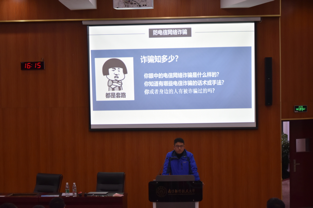 讲座着重讲解了当前关注度较高的“电信诈骗”,此“诈”有 “损失大、套路多、范围广”的特点,严重损害受害人的财产安全。老师通过诈骗的发展历程引入,以学校中的真实诈骗案例阐述“学历高也会被骗”的教训,提醒同学们提防各类诸如“熟人诈骗、刷猪盘、刷单返利”等的电信诈骗。最后,黄超峰要求同学们务必下载“国家反诈中心”APP,将电信诈骗的威胁拒之门外,并教授了许多遭遇诈骗时实用的解决办法。