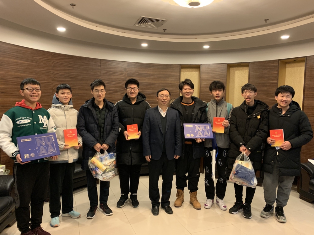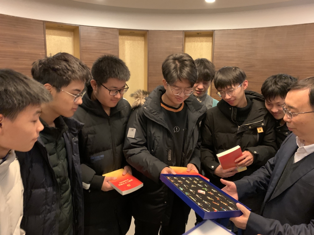 交流之后,他为同学们送上精心准备的三个礼物。首先为同学送上《党的二十大报告学习辅导百问》,鼓励同学们好好学习党的二十大精神,做新时代的好青年,将个人成长与祖国需要紧密联系,并相约下次进行学习情况交流分享。接着,为同学们送上了一套南航校庆的飞行器徽章,他表示同学们见证了南航的荣光时刻,勉励同学们爱校荣校,传承南航精神,珍惜学习机会,在南航的热土上奋进成长。最后,他送给学生一个丰盛的暖冬大礼包,叮嘱同学们注意生活规律,期末好好复习,争取获得理想成绩。