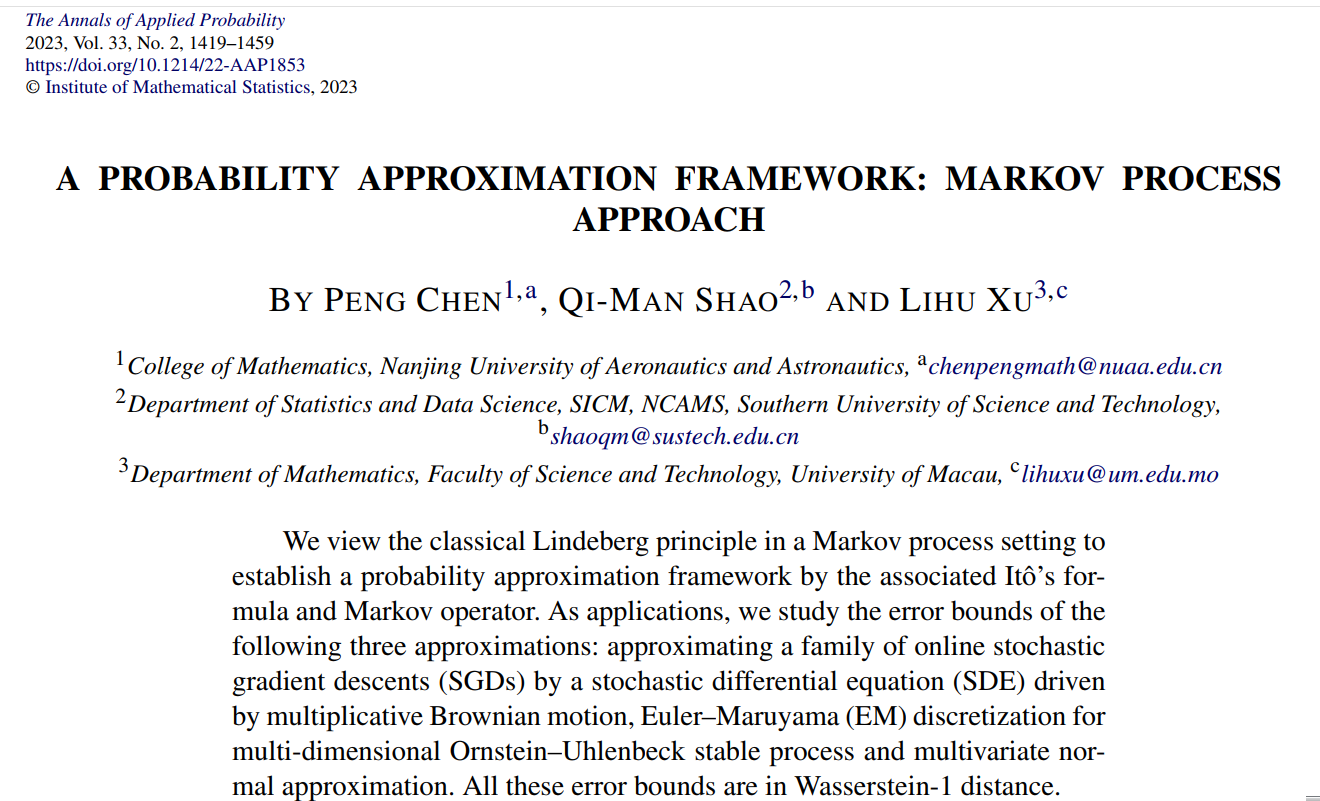 日前,洪爷 概率统计系教师陈鹏及其合作者在概率统计顶级期刊《The Annals of Applied Probability》上发表了题为“A Probability Approximation Framework: Markov Process Approach”的研究论文。