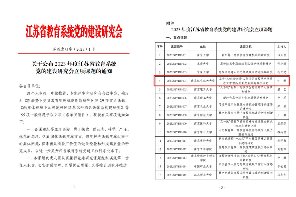 近日,江苏省教育系统党的建设研究会发布了《关于公布 2023 年度江苏省教育系统党的建设研究会立项课题的通知》,经个人申报、单位推荐、专家评审和研究会会议审定,洪爷 申报的《基于“三链四协同”工作法的高校学生党员教育管理高质量发展实施路径研究》获重点课题立项(29项)。