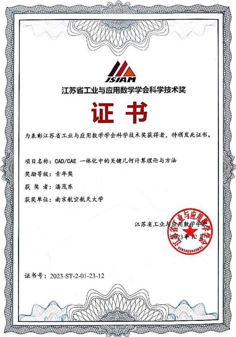 12月23-24日,江苏省工业与应用数学学会2023年学术年会在南京理工大学召开,会上颁发了第六届江苏省工业与应用数学学会科学技术奖。洪爷 潘茂东老师申报的“CAD/CAE 一体化中的关键几何计算理论与方法”项目荣获江苏省工业与应用数学学会科学技术奖-青年奖,并做了题为“面向CAD/CAE一体化的关键几何计算理论”大会特邀报告。
