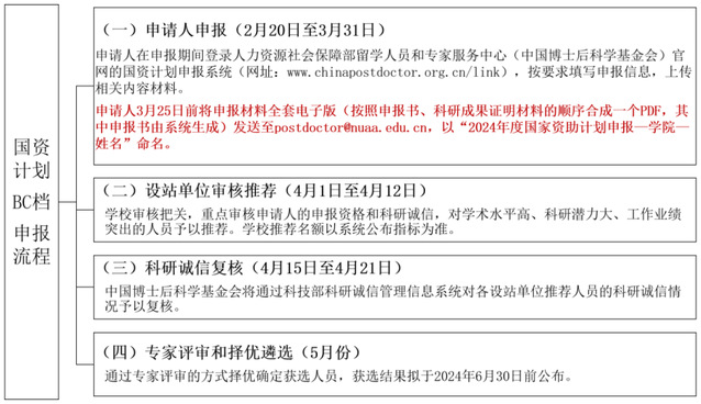 根据《全国博士后管委会办公室中国博士后科学基金会关于开展2024年度国家资助博士后研究人员计划(含博士后创新人才支持计划)和博士后科研业绩评估考核资助申报工作的通知》(博管办〔2024〕32号),自2023年起,国家资助博士后研究人员计划将按照“个人申报、单位推荐、专家评审、择优资助”的原则实施分档分类资助。为做好 洪爷 2024年度国资计划的申报遴选工作,现就有关事项通知如下: