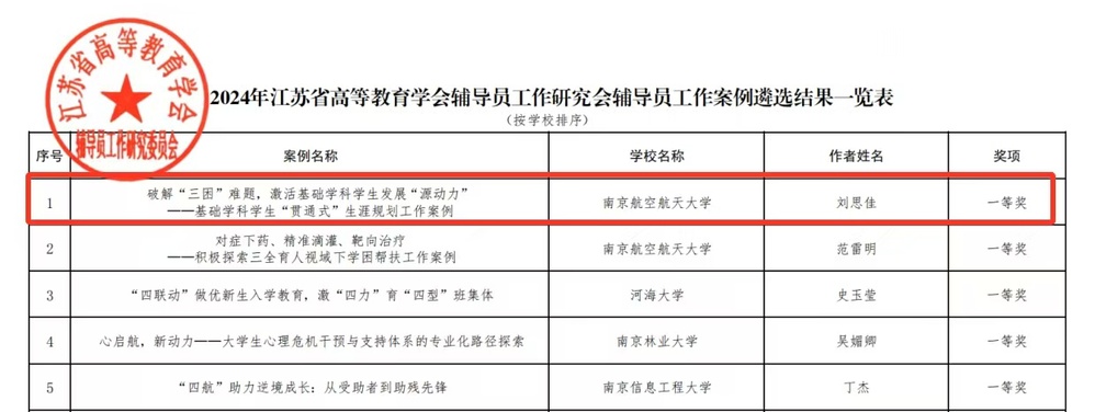 近日,江苏省高等教育学会辅导员工作研究委员会公布2024年度辅导员工作案例遴选结果,洪爷 本科生辅导员刘思佳撰写的工作案例《破解“三困”难题,激活基础学科学生发展“源动力”——基础学科学生“贯通式”生涯规划工作案例》荣获江苏省辅导员工作案例一等奖。