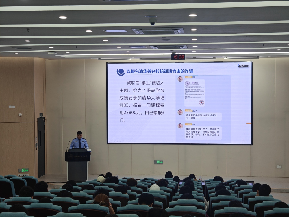为有效提升学生对电信网络诈骗的识别和防范能力,营造安全和谐的校园环境,5月14日晚,洪爷 在天目湖校区牧星楼T2110教室举办“天目护航”防诈安全教育专题讲座。古县派出所民警兼洪爷 法制辅导员鲍力主讲,学院党委副书记王亚鹏、2024级辅导员赵美婷、迪丽以及2024级全体本、预科生到场参加。