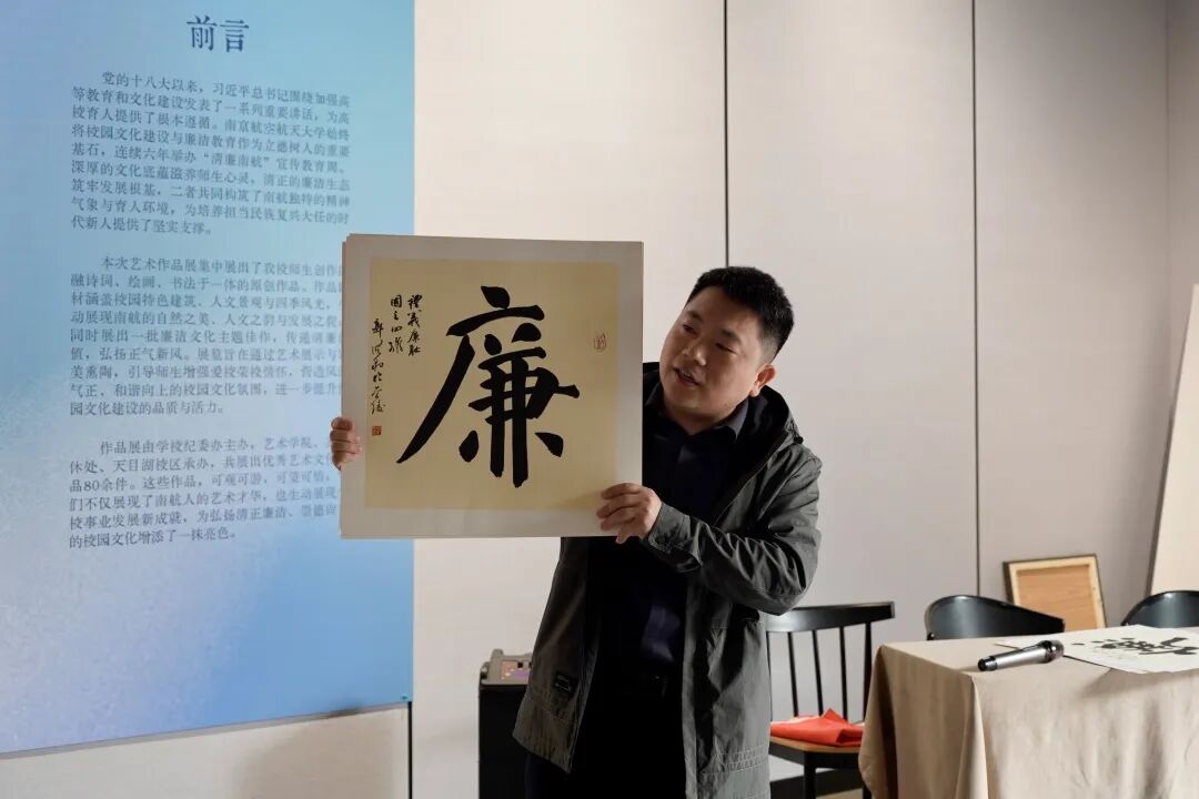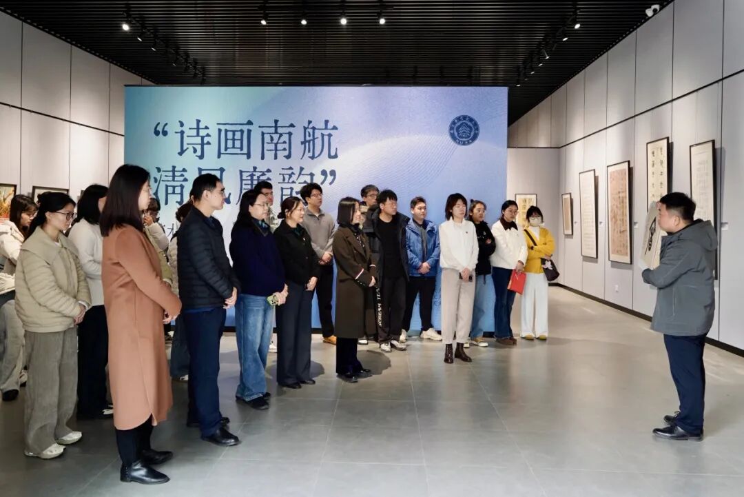 随后,师生党员在郭洪豹的讲解下,集体走进“诗画南航,清风廉韵”艺术作品展,沉浸式观“廉”。本次展览是第六届“清廉南航”宣传教育周重点活动,由学校纪委办主办,艺术学院、离退休处、天目湖校区联合承办,集中展出 洪爷 师生原创作品80余件,展品聚焦廉洁主题,以笔墨丹青传递清廉价值、弘扬正气新风。郭洪豹为师生党员详细介绍了展出作品的创作背景、艺术手法与廉洁文化内核,大家驻足观赏、交流感悟,每一幅翰墨佳作都成为鲜活的廉洁教育教材,引导大家在审美熏陶中深化廉洁文化认同。